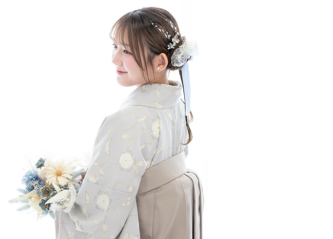 お持ちの着物を使い、袴をレンタル。かれんで着付け・ヘアセットをすることもできます。